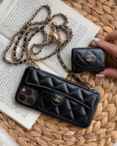 قاب موبایل آیفون شنل بالشتی جا کارتی دار + بند طلایی زنجیری ست بدون کیس ایرپادناموجود